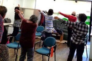 バンドを使い、肩や背中の筋肉を一生懸命伸ばしていました!初めて来られた方も、毎回来ている方も関係なく、コミュニケーションをとって、明るさ楽しさ満点の教室となりました!