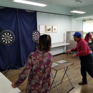最初は、的の真ん中「ブル」を狙う基本練習から。皆さん、狙いを定めては「もう少しだった!」「今のは惜しいね!」と声を掛け合いながら、和気あいあいとした雰囲気で取り組んでいました。特に今回は、新しく参加された方も数名いらっしゃり、常連の皆さんが優しく投げ方を教える姿も。こうした“教え合い・学び合い”の交流は、脳の活性化にもつながります。