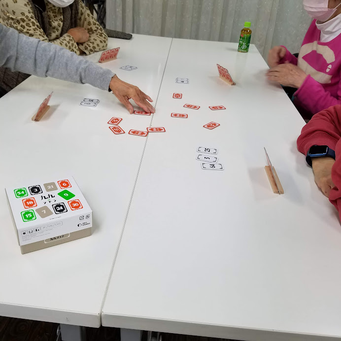 そして今回の目玉は、初めて挑戦する新しいゲーム「九九ジャン」。九九の答えになるように数字を組み合わせて役を作っていく、まるで麻雀のようなゲームです。「あれ?56って何かける何だった?」と数字を思い出しながら手札を並べる姿は真剣そのもの。けれど、思わず笑ってしまうような珍プレーもあり、歓声や笑い声が上がっていました。楽しみながら自然と頭を使えるところが、このゲームの魅力です。