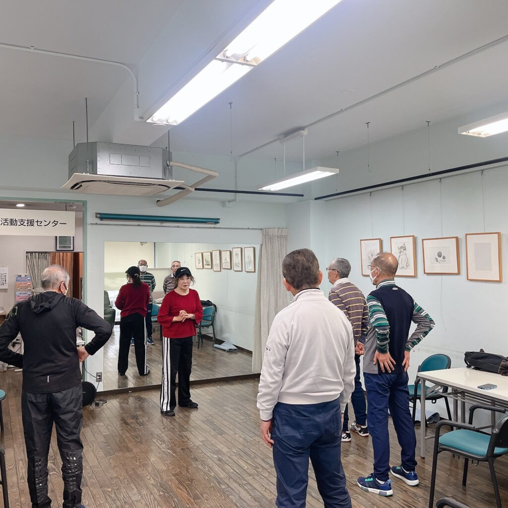 体をほぐしてから、椅子に座ったままできるトレーニングや、無理のない立ち姿勢での筋トレを行いました。